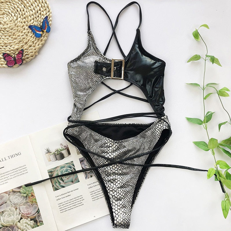 Every baddie should own one of these. Snakeskin print monokini with straps and buckle.