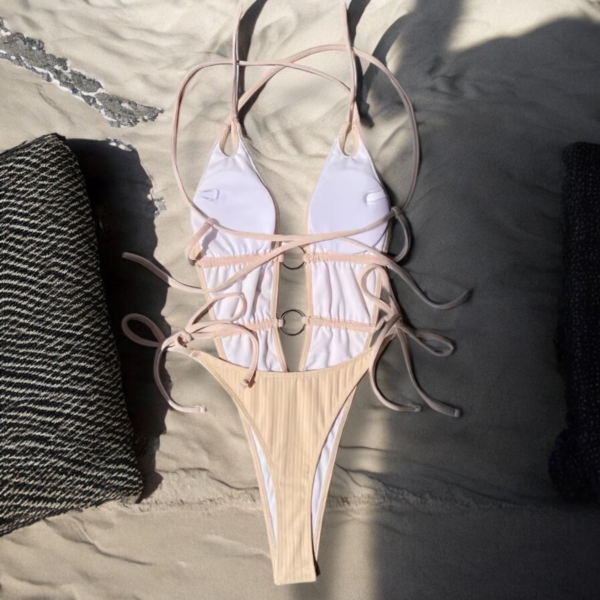 The crossbody strings add an edgy yet elegant touch, making this design stand out from the crowd. Crafted in a sophisticated beach beige hue, it radiates effortless luxury while complementing every skin tone. Silver circular embellishments provide the perfect pop of glamour, ensuring you sparkle in the sun.