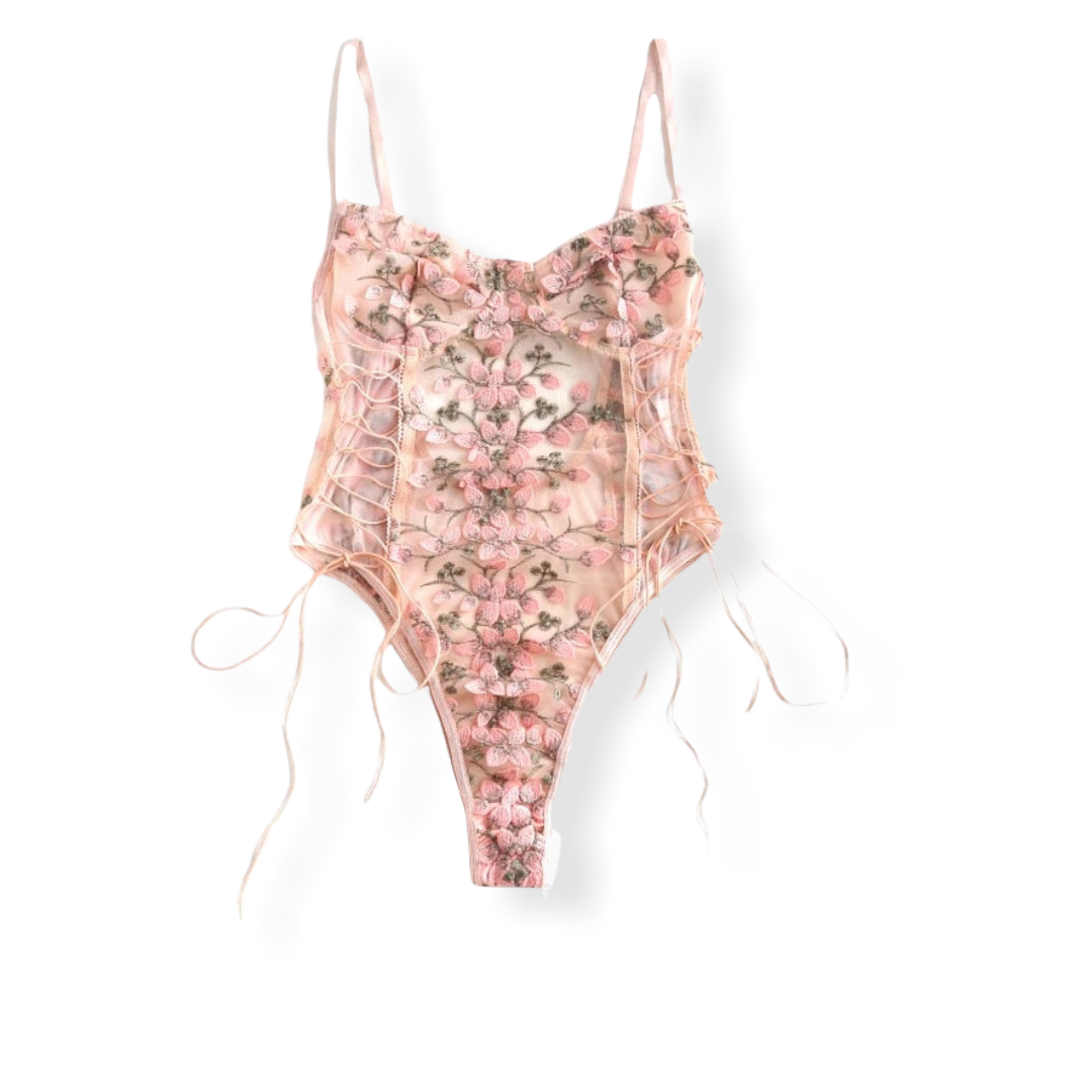 Floral embroidered teddy with side straps and sheer body. Full cup with underwire, high waist and cheeky back.