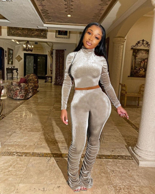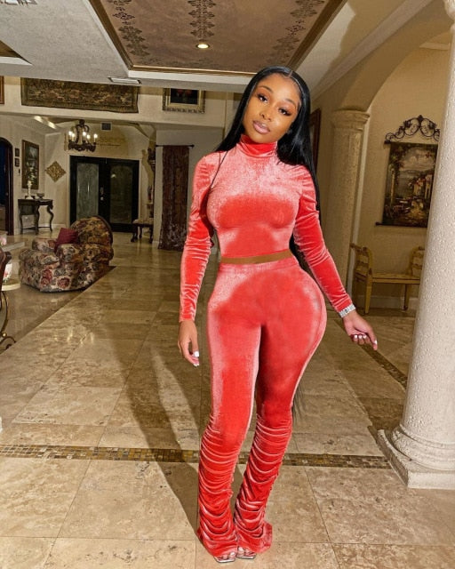 Luxury Velvet cropped top and jogger set with ruffled pant leg.