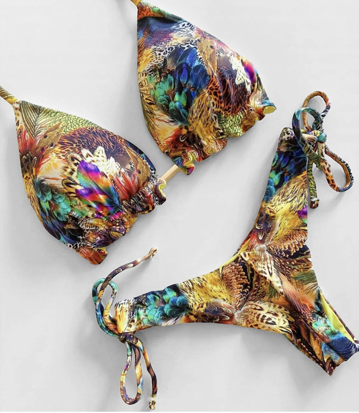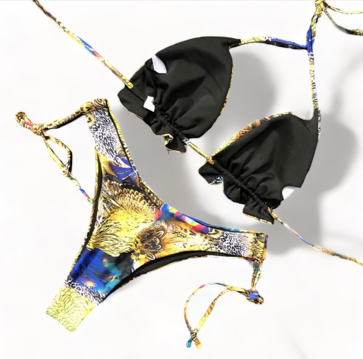 Greek Goddess vibes with this triangle string two piece low rise bikini, peacock tropical blue print with black lining , ruffled fabric on underboob and a royal gold centerpiece. Bikini bottoms has a double loop string design for more hip support. Imported.