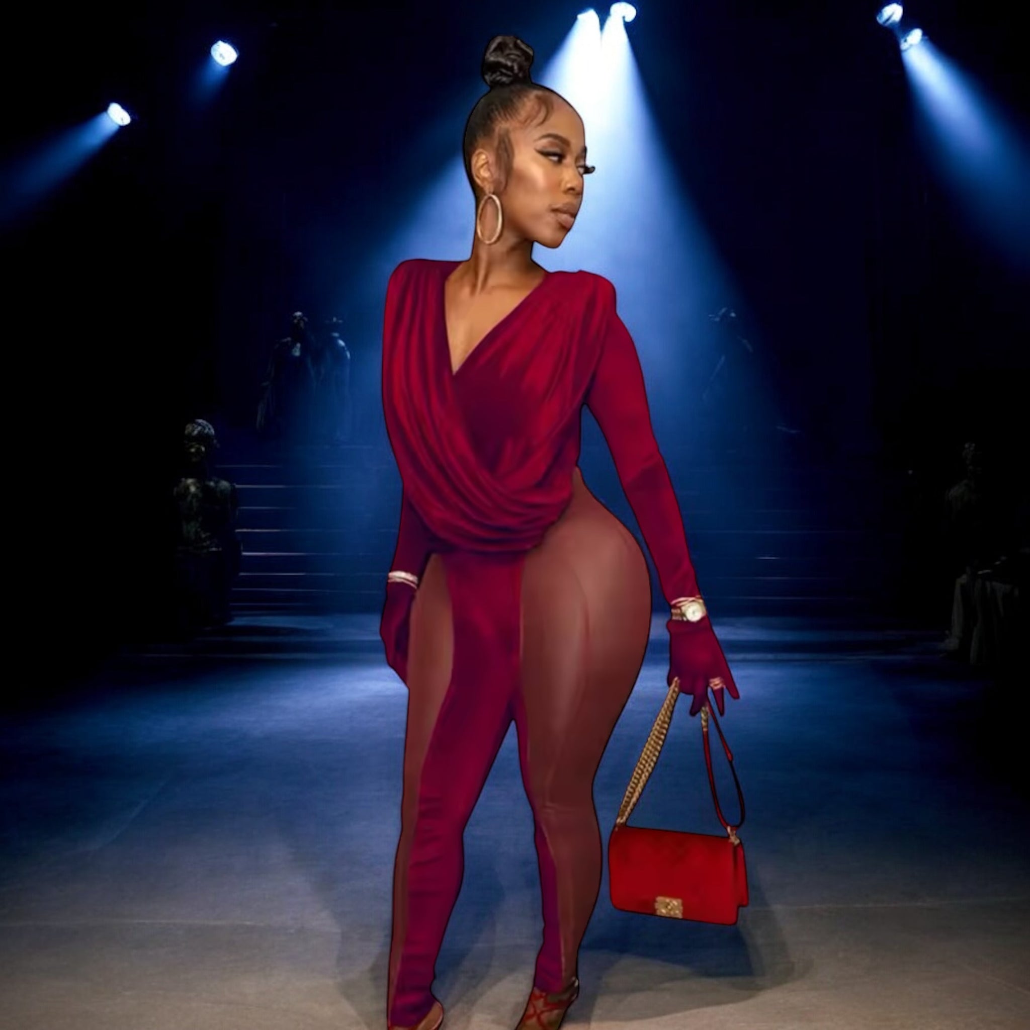 Get ready to steal hearts in the Hearts on Deck Jumpsuit, a bold, body-sculpting masterpiece designed to make every move unforgettable. Featuring a sultry mesh outer layer that contours your curves, plush velvet panels along the inner thighs for a luxe contrast, and a draped bust design that adds just the right touch of allure. Long sleeves bring a sleek, sophisticated finish, making this the perfect show-stopping look for nights when you're the main attraction.