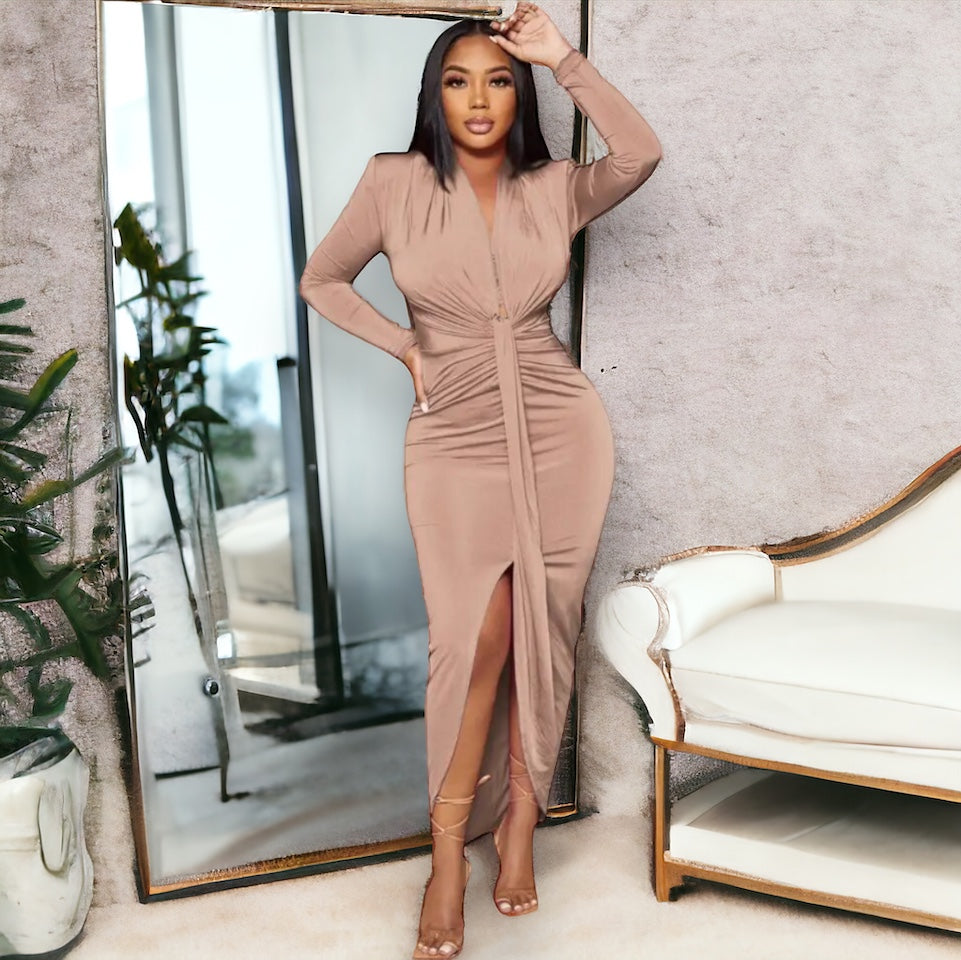 Introducing our stunning Keep It Classy Neck Plunge dress featuring a daring neck plunge and a high front middle split, guaranteed to turn heads. Its draped midsection adds an elegant touch, flattering your silhouette with every movement. Perfect for those special occasions where you want to make a statement. Crafted with care and attention to detail, this dress combines sophistication with allure for a look that's both captivating and timeless.