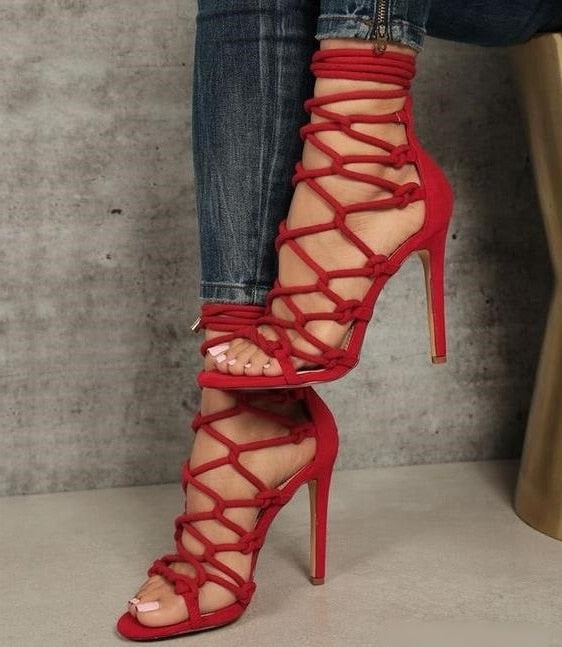 Stiletto heel and pointed toe with knot and tie strings that tie up toward the ankle. Perfect for date night, special occasion. Pairs well with Vanessa Vixen dresses and pants.