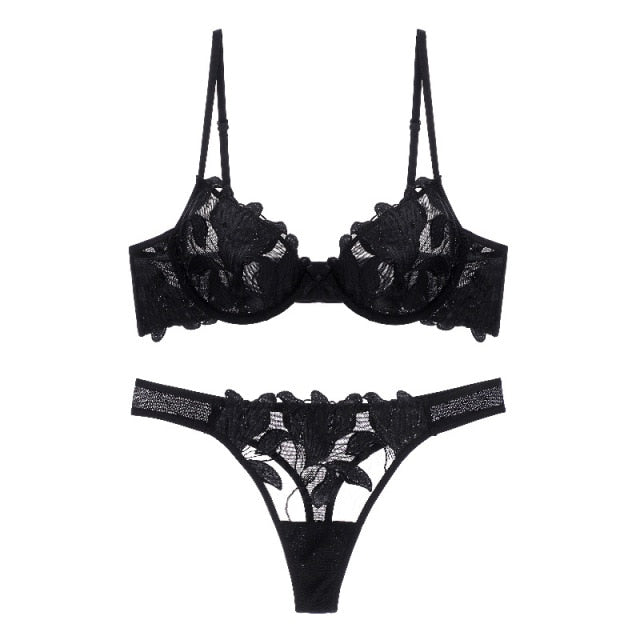 Ultimate expression of femininity in this floral embroidered bra & panty with sheer cup with underwire. Bow accents in middle. Lace thing with identical floral embroidery.