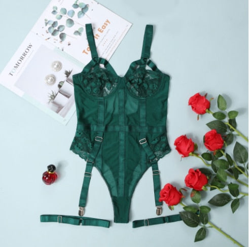 Spice things up with this exotic lace and mesh teddy. 2 banded leg garters set with adjustable straps.