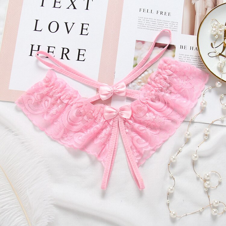 Love Scene Lace Crotchless Panty with bow accent near rear opening. Stretchy. One size only. For waist up to 31 inches.