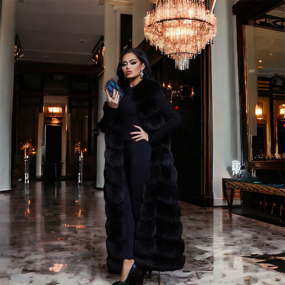 Pleated faux fur paneling from head to toe with luxurious soft look and feel. Sleeveless. Imported.