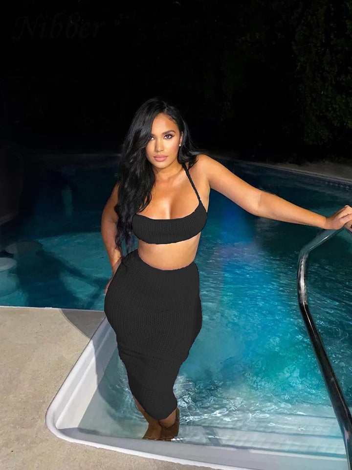 The skirt features a flattering silhouette that accentuates your curves, while the string-tied top adds a touch of allure and adjustability. Whether you're lounging at home or stepping out for a brunch date, this versatile set effortlessly combines elegance and ease. Dress it up with heels or keep it casual with sneakers—the choice is yours. Experience the ultimate blend of fashion and comfort with our Knitted Skirt Set.