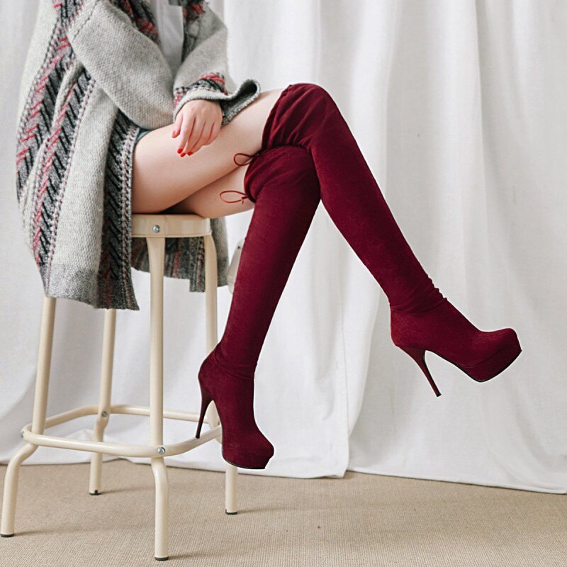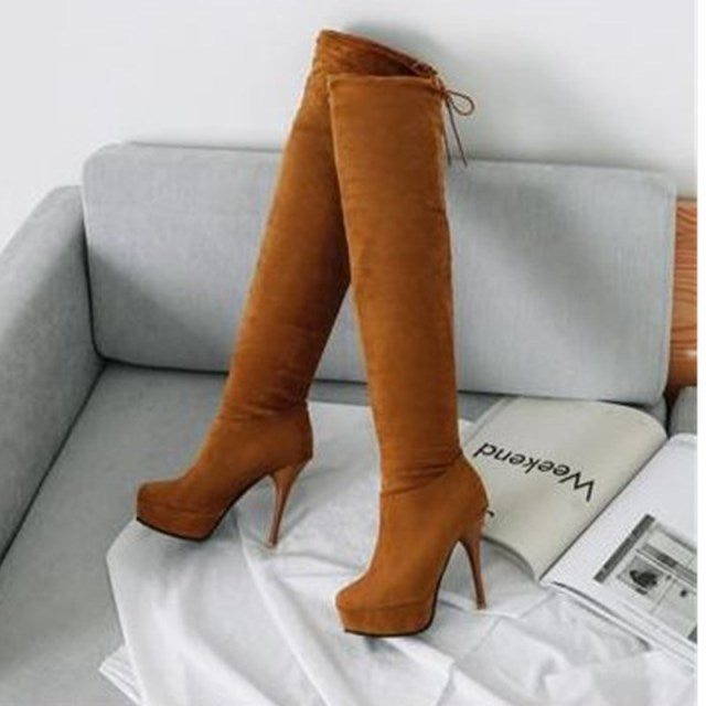 Platform suede over the knee boots with butterfly closure in back. Colors: Black, Wine, Camel Yellow, and Nude Beige.