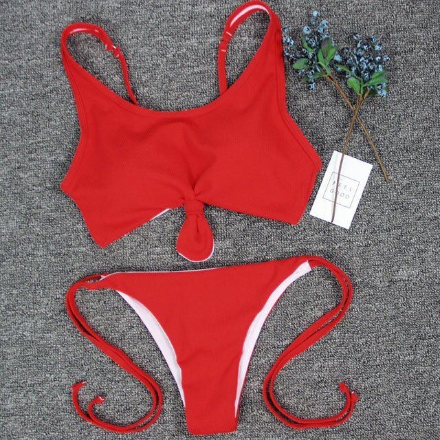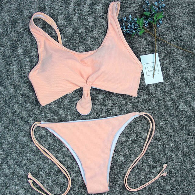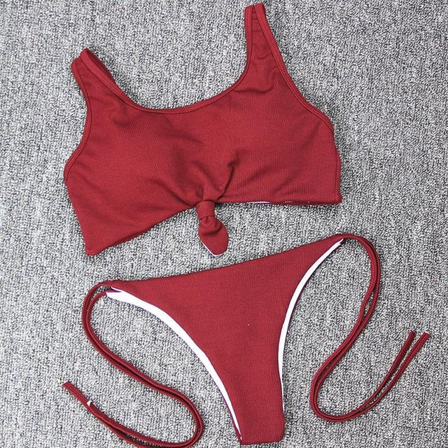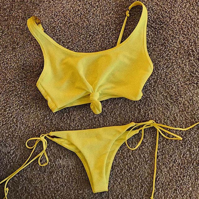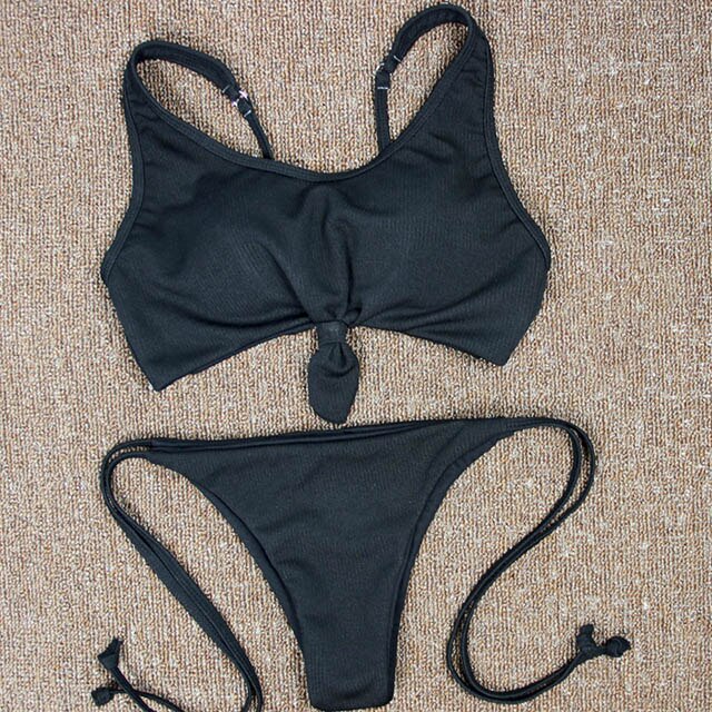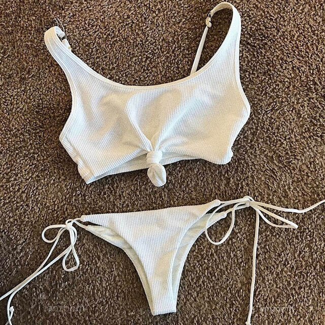 Ribbed sports bra styled top with front tie. Waist tie bikini bottom with ribbed texture and pattern.