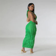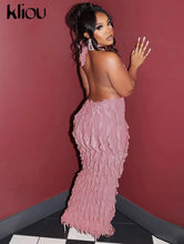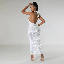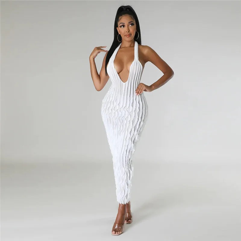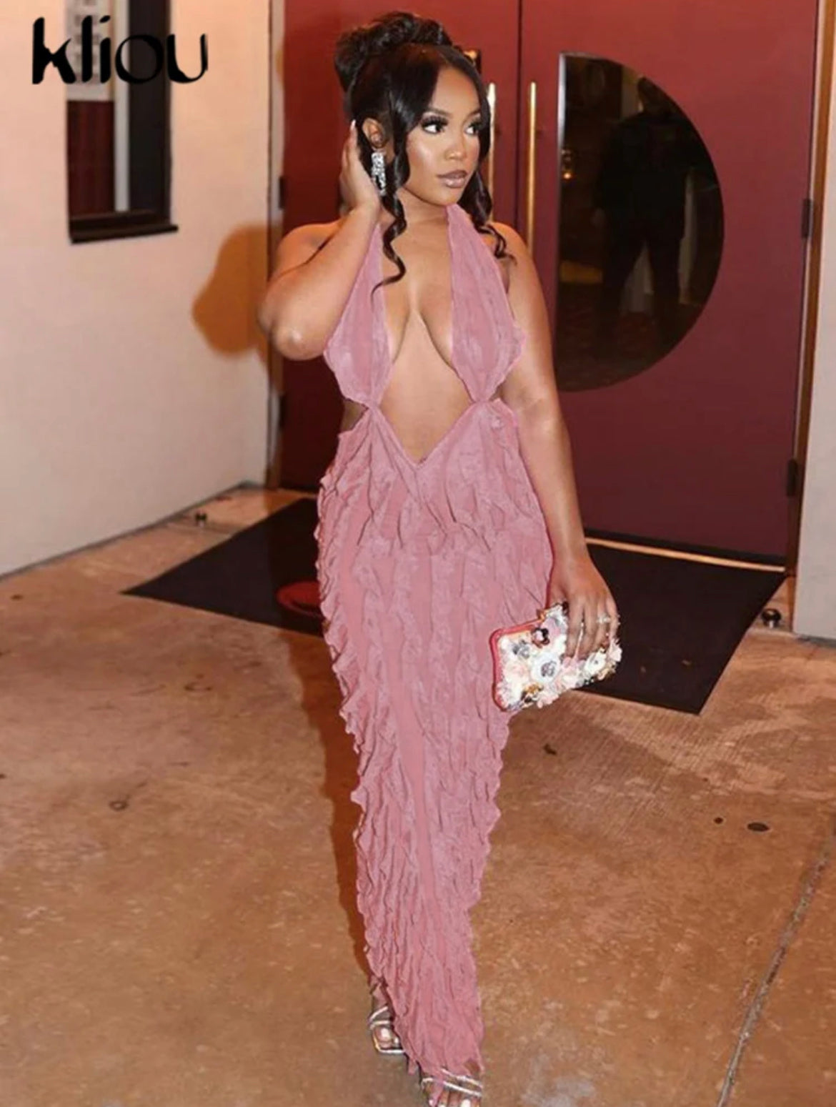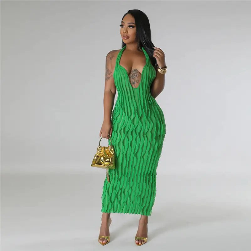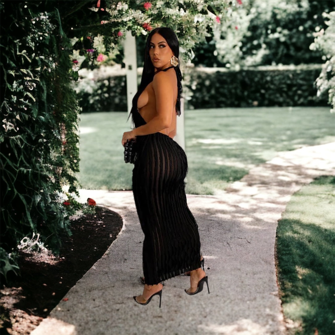 Ruched fitted sheer long dress with ruffled vertical lining. Plunging Deep V neck line halter with backless low cut. Quality stretch material. Imported.