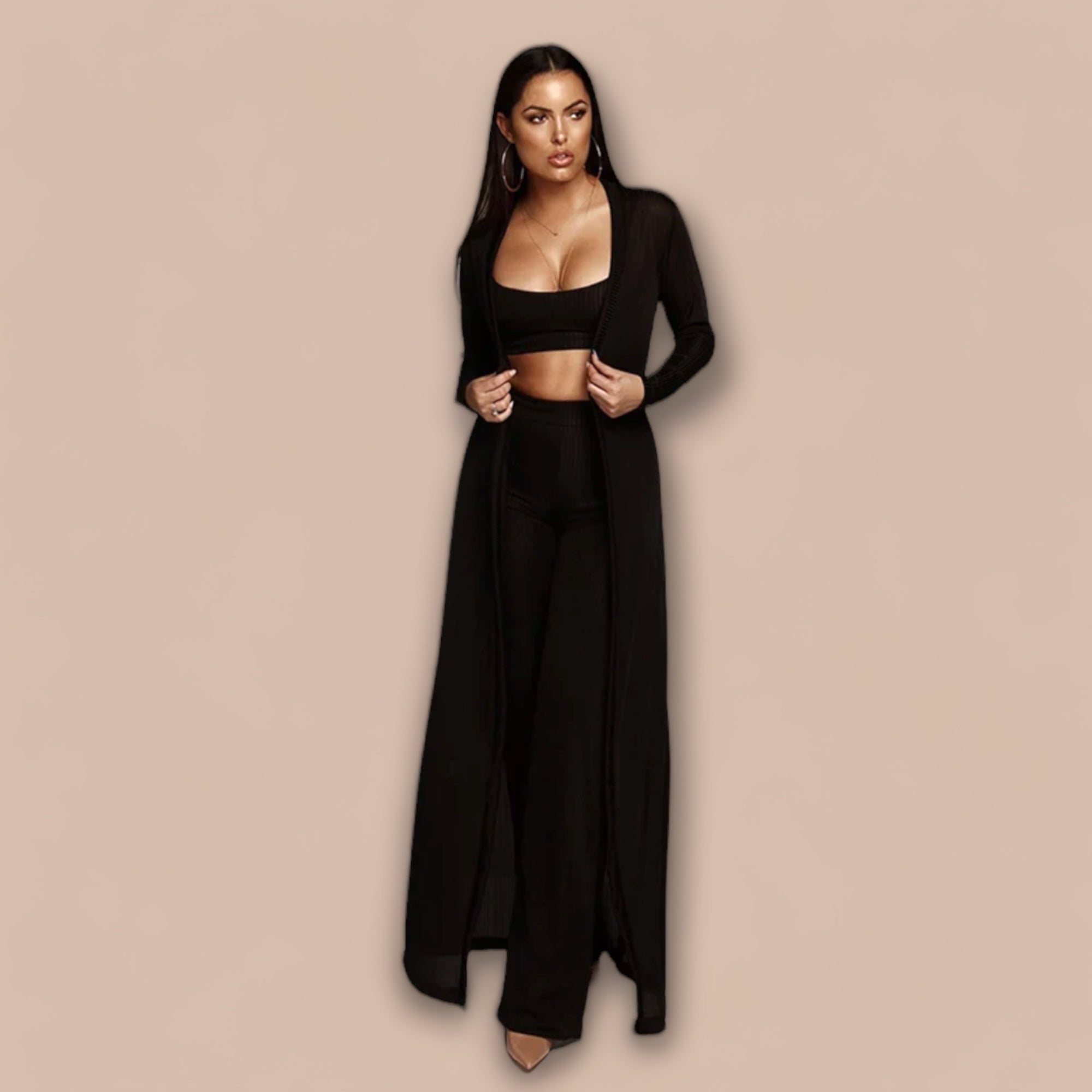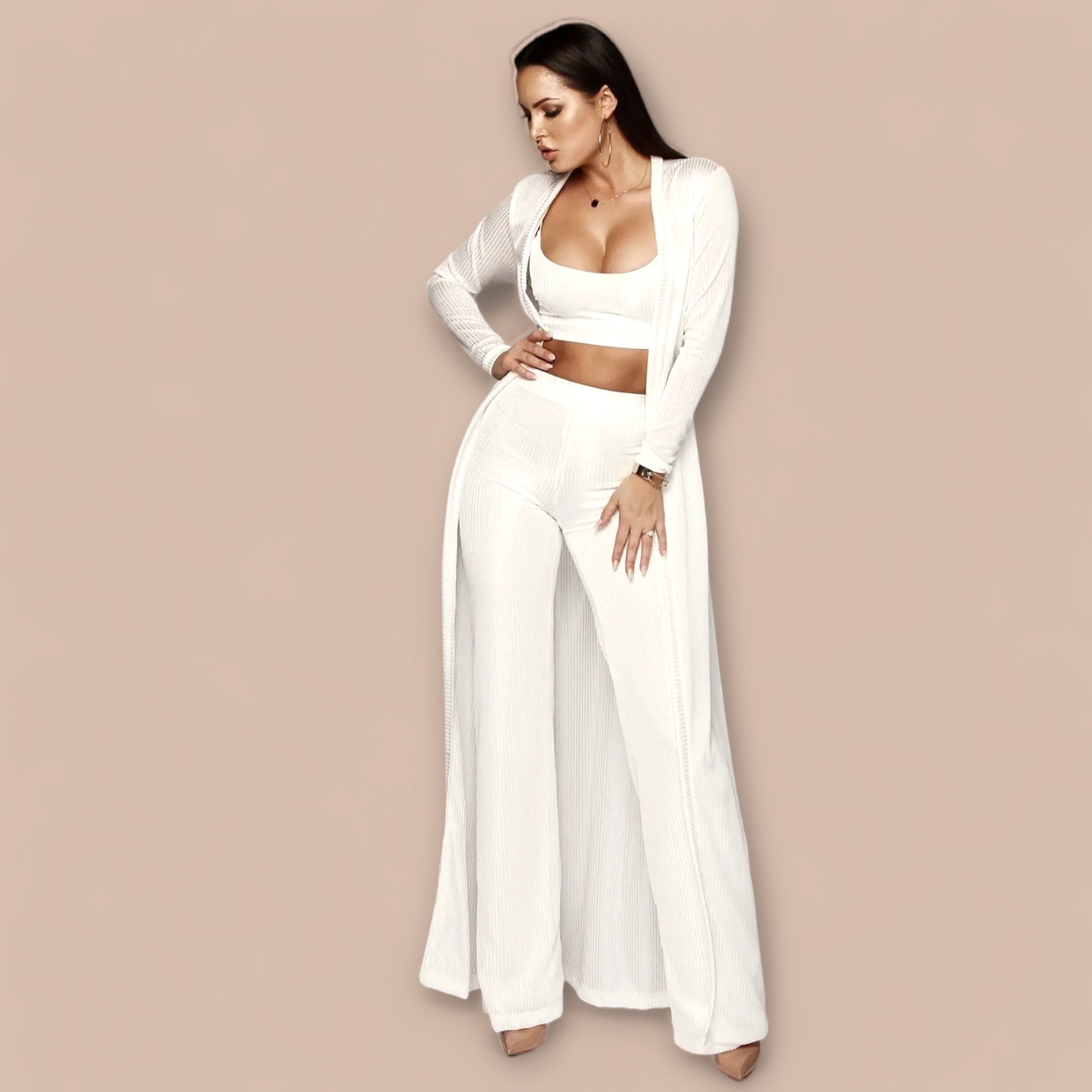 Fall in love with this 3 piece pant set. Ribbed quality material with flare pants. Slim strap bralette and ankle length coat with separate waist tie. Imported.